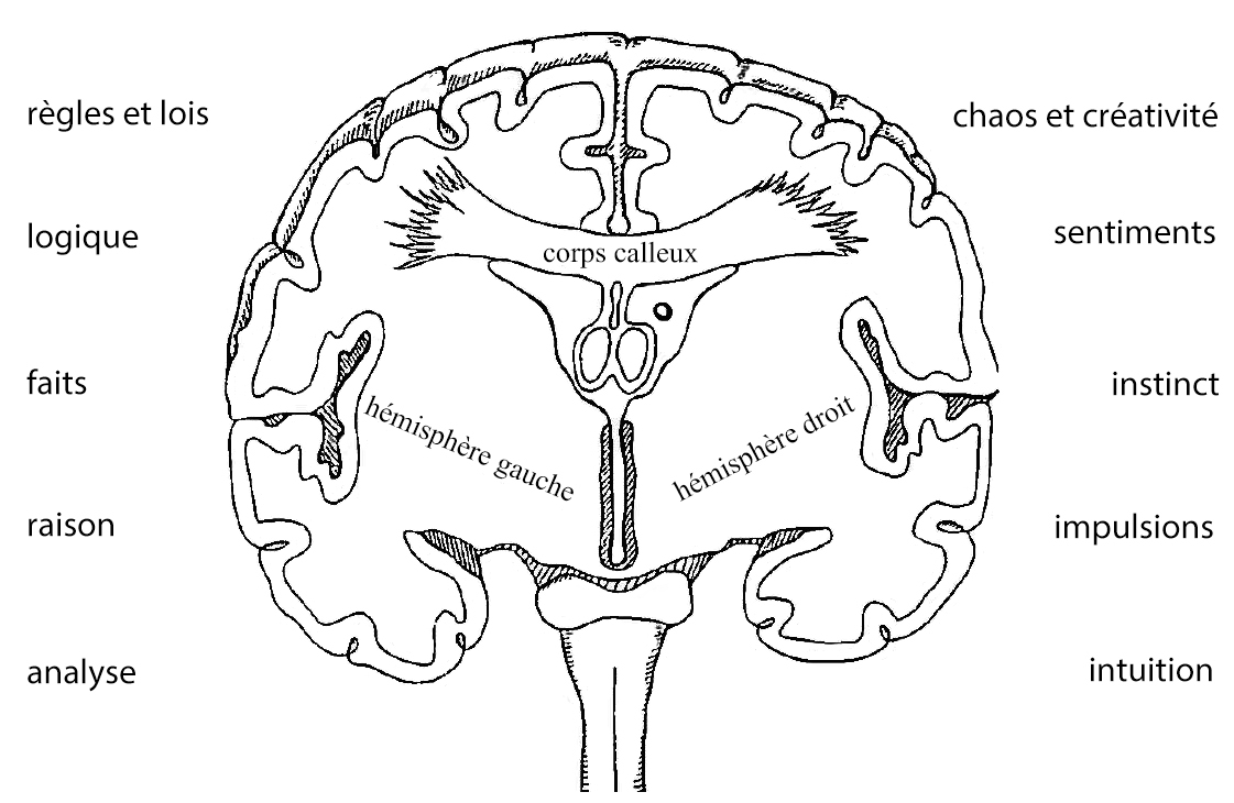 Sur le long chemin vers une conscience et une personnalité autonome, l'enfant (désormais dans le mem violet/pourpre) se détache de cette dépendance. Encore entièrement guidé par des impulsions, le cerveau apprend progressivement à reconnaître, à interpréter et à séparer les premiers liens : sujet ou objet – les personnes et les choses sont bonnes ou mauvaises, propres ou sales, gentilles ou méchantes. Avec le début de l'individuation et de la socialisation, la perception duale s'étend dans la vision de « ceci ou bien cela » : soit clair, soit sombre. Cette distinction et cette séparation, en oppositions partiellement incompatibles d'une part, et en polarités partiellement conditionnantes et complémentaires d'autre part, constituent la condition préalable à la pensée intellectuelle consciente et à l'apprentissage cognitif dans notre culture et société occidentale (ceci dans les mem rouges, bleus et orange ci-après).
